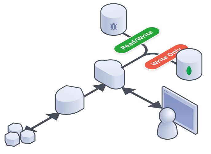The graph database (lovingly marked with the bug icon) is too rigid for the rapid iteration we’re doing. Additionally, although all other parts of our architecture are serverless, the graph database is a shared instance that occasionally slows down to the point that we get timeouts.